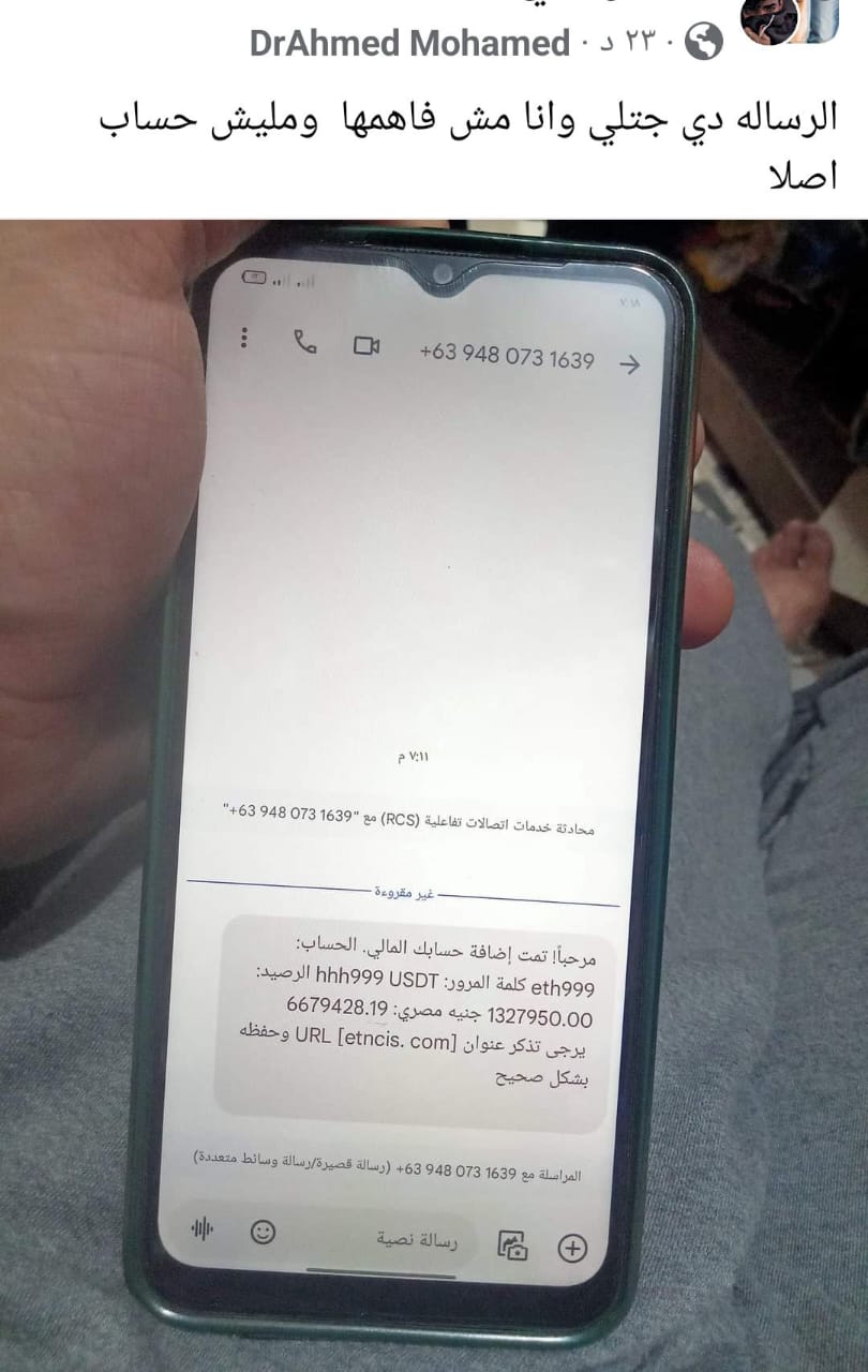 تداول رواد مواقع التواصل الاجتماعي انتشار رسالة نصية أرسلت لعدد كبير من المواطنين، تشير إلى إيداع مبلغ مالي يتخطى 6 ملايين جنيه، ويطلب اتباع عدة طرق لإضافة المبلغ الوهمي.