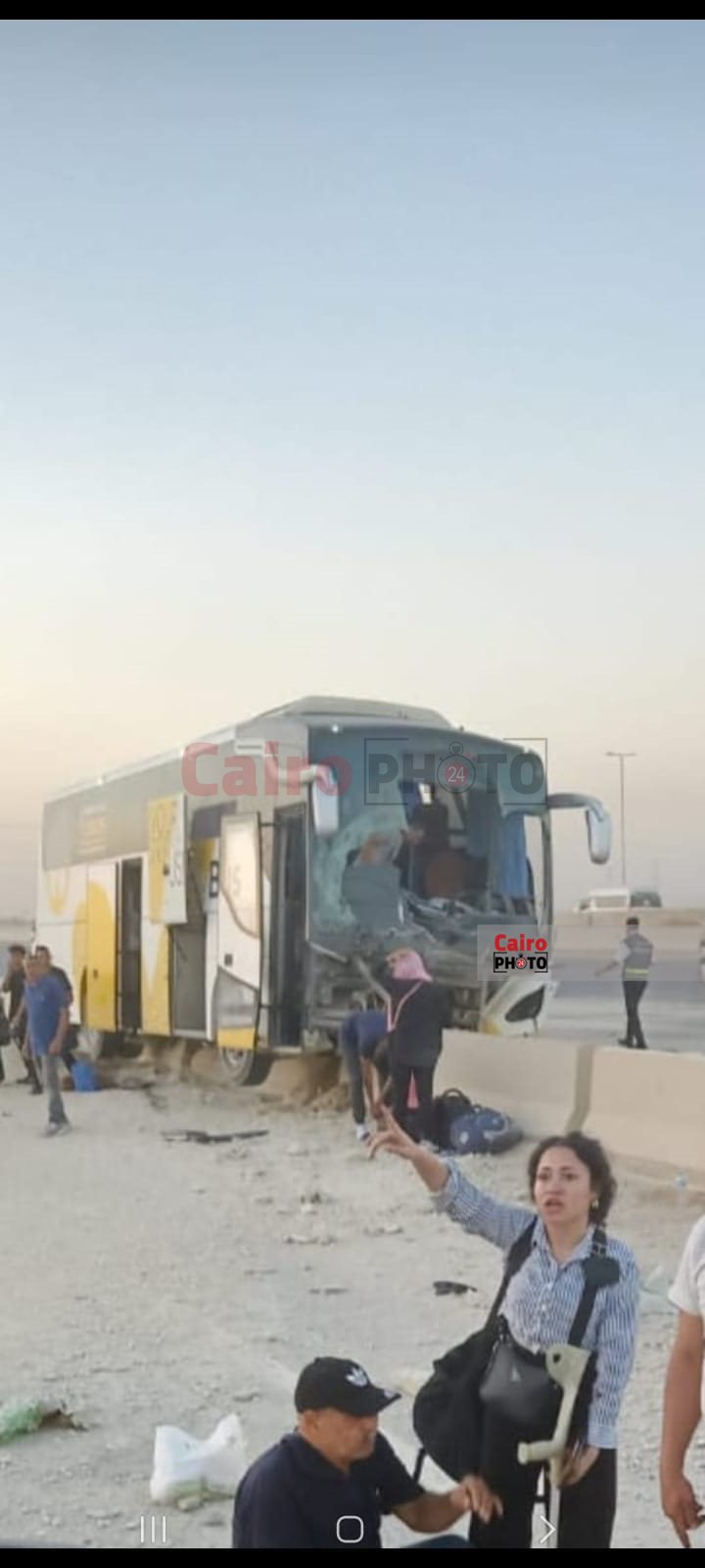 إصابة 14 شخصًا بينهم أجانب إثر اصطدام أتوبيس بالرصيف على طريق القاهرة السخنة| صور