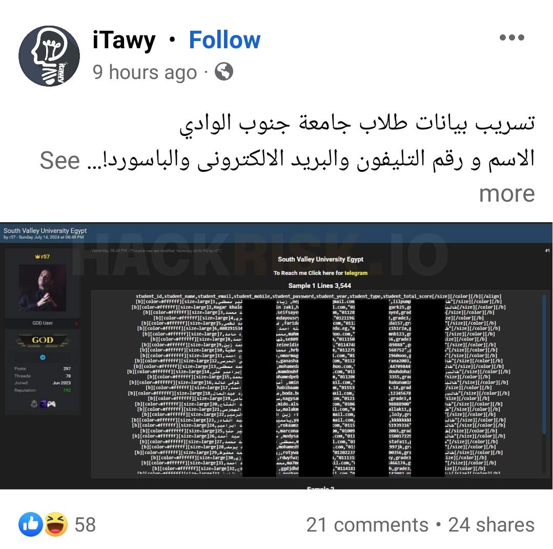 وكان رواد مواقع التواصل الاجتماعي فيس بوك، تداولوا اليوم عدة منشورات، بشأن تعرض 3 جامعات على مستوى الجمهورية هي: جنوب الوادي، بني سويف، سوهاج، للاختراق من قِبل هاكر للحصول على بيانات جميع الطلاب.