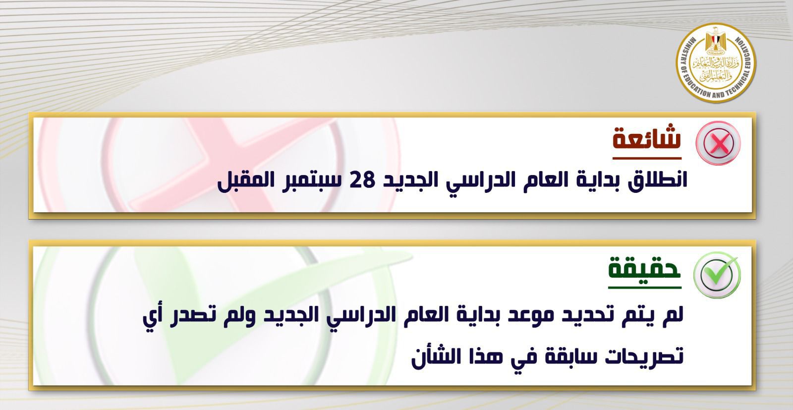 وأكدت وزارة التعليم خلال بيان لها منذ قليل، أنه لم يتم تحديد موعد بداية العام الدراسي الجديد، ولم تصدر أي تصريحات سابقة في هذا الشأن.