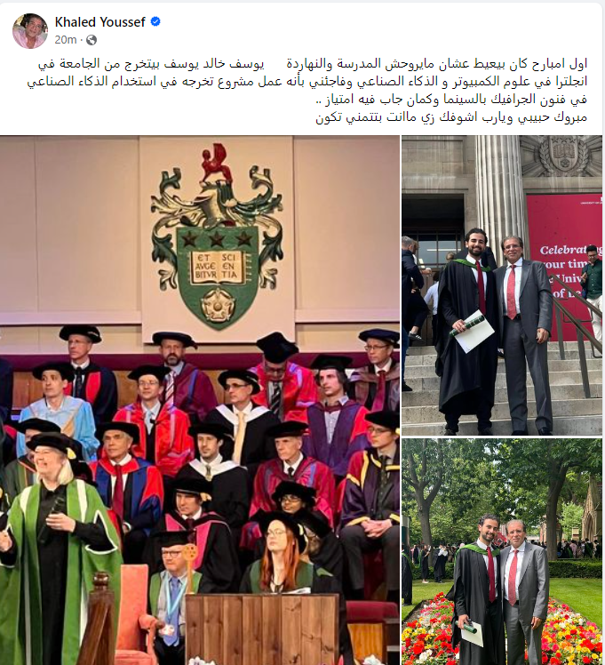ونشر خالد يوسف مجموعة من صور تخرج نجله، عبر حسابه الشخصي بموقع التواصل الاجتماعي فيسبوك معلقا: أول امبارح كان بيعيط عشان مايروحش المدرسة والنهاردة يوسف خالد يوسف بيتخرج من الجامعة في إنجلترا في علوم الكمبيوتر والذكاء الصناعي، وفاجئني بأنه عمل مشروع تخرجه في استخدام الذكاء الصناعي في فنون الجرافيك بالسينما وكمان جاب فيه امتياز.. مبروك حبيبي ويارب أشوفك زي ما أنت بتتمنى تكون.