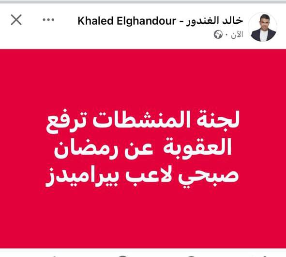 وكتب الغندور على صفحته الشخصية عبر موقع التواصل الاجتماعي فيس بوك: لجنة المنشطات ترفع الإيقاف عن رمضان صبحي لاعب فريق بيراميدز.