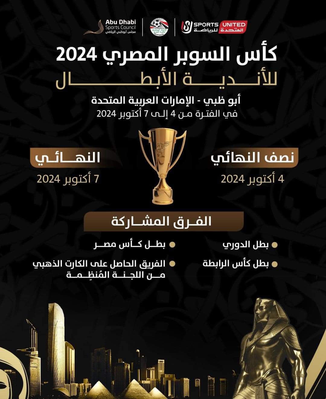 وتقرر بشكل رسمي إقامة بطولة كأس السوبر المصري للأندية الأبطال من 4 إلى 7 أكتوبر، وستقام في إمارة أبو ظبي بدولة الإمارات العربية الشقيقة بالتعاون مع مجلس أبو ظبي الرياضي