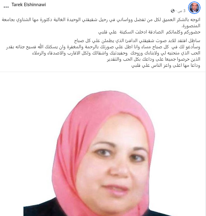 وكتب طارق الشناوي منشورًا، عبر حسابه الشخصي على موقع التواصل الاجتماعي فيس بوك: أتوجه بالشكر العميق لكل من تفضل وواساني في رحيل شقيقتي، الوحيدة الغالية الدكتورة مها الشناوي بجامعة المنصورة، حضوركم وكلماتكم الصادقة أدخلت السكينة على قلبي، سأظل أفتقد للأبد صوت شقيقتي الدافئ الذي يطمئن علي كل صباح.