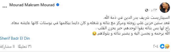 بينما كتب الفنان مراد مكرم نعيًا للراحل، عبر حسابه الشخصي بموقع التواصل الاجتماعي فيس بوك، قال فيه: السيناريست شريف بدر الدين في ذمة الله، قعد سنين حزين على زوجته ومركز مع بناته وشغله وكان دايمًا بيكلمها في بوستات وكأنها عايشة معاه.. راح لها خلاص بس بناته بقوا لوحدهم.. خبر يحزن القلب.. الله يرحمه ويحسن إليه ويصبر بناته ويتولاهم.