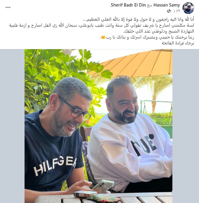 وكتب أحد المقربين من شريف بدر الدين سبب وفاة الراحل، حيث قال في منشور له عبر حسابه الشخصي بموقع التواصل الاجتماعي فيس بوك: إنا لله وإنا إليه راجعون ولا حول ولا قوة إلا بالله العلي العظيم.. لسة مكلمني يا شريف تقولي كل سنة وانت طيب يا بوعلي، سبحان الله زي الفل إمبارح وأزمة قلبية النهاردة الصبح ودلوقتي عند اللي خلقك.. ربنا يرحمك يا حبيبي ويصبر أسرتك وبناتك يا رب.