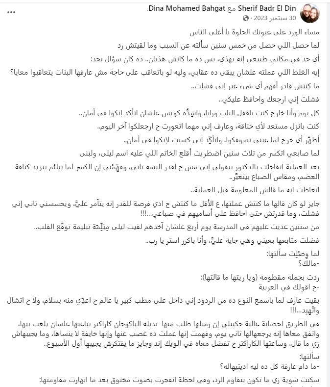 فكتب شريف بدر الدين منشورًا قبل وفاته، تحدث فيه عن زوجته الراحلة، وذلك عبر حسابه الشخصي بموقع التواصل الاجتماعي فيس بوك، قال فيه: لما حصل اللي حصل من 5 سنين سألته عن السبب وما لقيتش رد، أي حد في مكاني طبيعي إنه يهدى، بس ده ما كانش هذيان.. ده كان سؤال بجد إيه الغلط اللي عملته علشان يبقى ده عقابي، وليه لو بتعاقب على حاجة مش عارفها البنات يتعاقبوا معايا؟، ما كنتش قادر أفهم أي شيء غير إني فشلت، فشلت إني أرجعك وأحافظ عليكي، كل يوم وأنا خارج كنت بقفل الباب ورايا، واشِدُّه كويس علشان اتأكد إنكوا في أمان، كنت بانزل مستعد لأي خناقة، وعارف إني مهما اتعورت هرجعلكوا آخر اليوم، أطهَّر أي جرح لما عيني تشوفكوا، واتأكِّد إني كسبت لإنكوا في أمان.