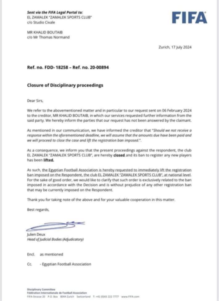 وحصل مسؤولو نادي الزمالك على خطاب رسمي يفيد بإنهاء أزمة خالد بوطيب بشأن مستحقاته الفترة الماضية، إذ حصل على حكم من فيفا ضد القلعة البيضاء.