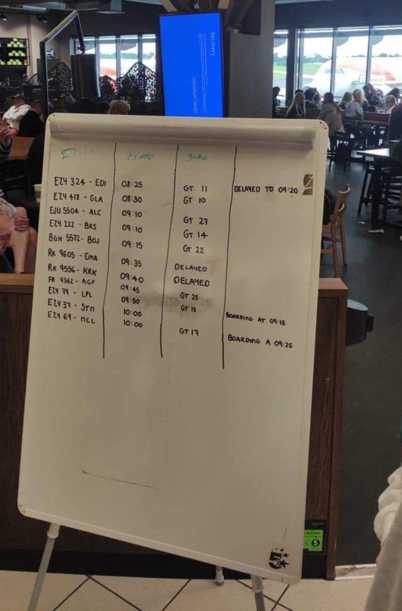 في مشهد استثنائي، بعدما شهدته مطارات العالم اليوم من تعطل خدماتها متأثرة بالعطل الفني العالمي، عادت سلطات المطار في ألمانيا لأول مرة للوراء لما قبل التكنولوجيا واستعانت بسبورة الحائط، لكتابة الرحلات عليها وبطاقات الصعود للركاب بخط الأيدي.