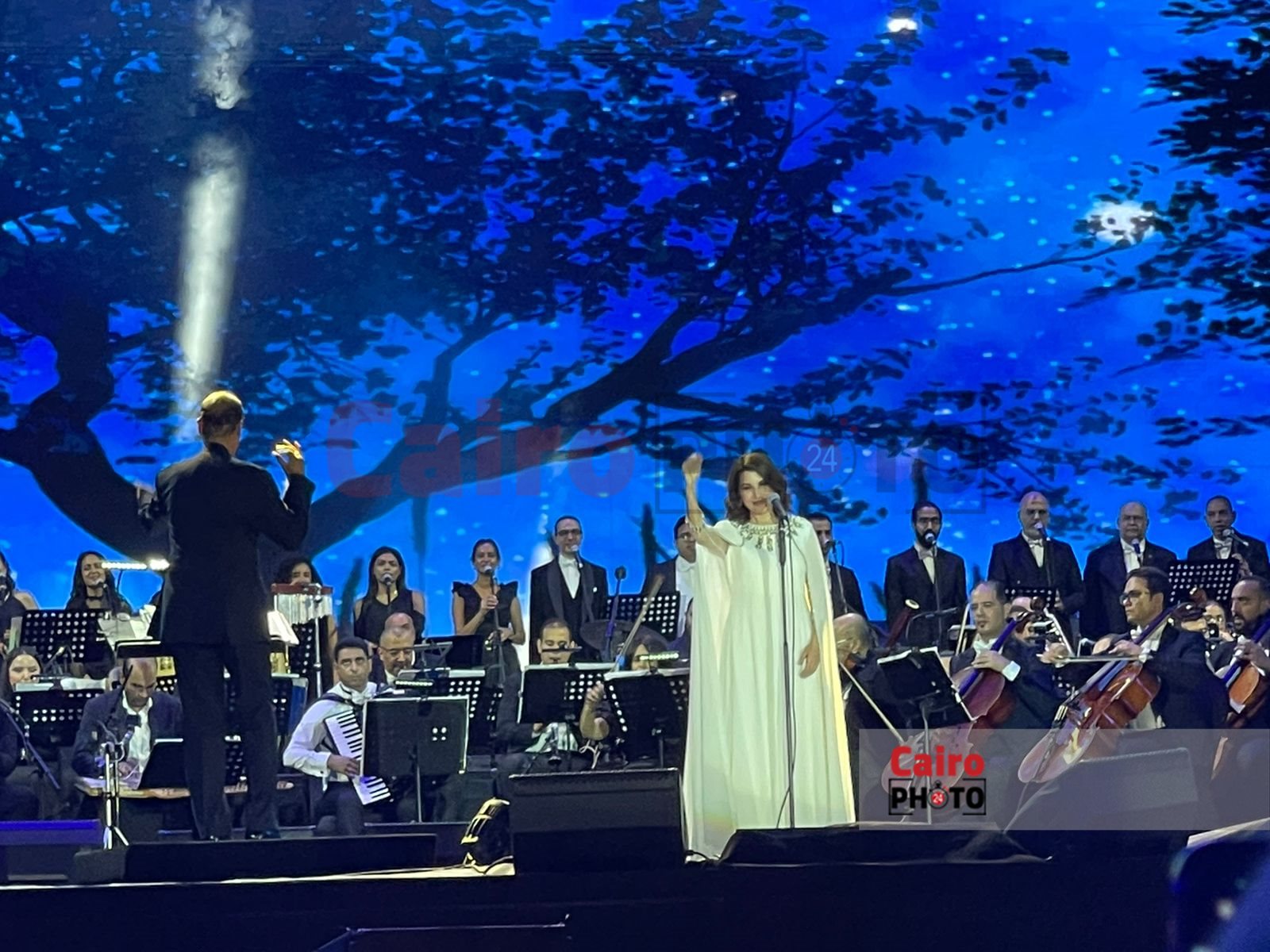 وأضافت: مصر اللي كل شئ فيها يتحب، فرحانة بسماها وهواها وأرضها وفنها وكل شئ حلو فيها، فرحانة أني بقدم لكم هذه الحفلة بقيادة المايسترو نادر عباسي، بوجود الفنانين اللي موجودين معانا، وأتمنى إن سهرتكم تكون ممتعة، وبشكر حضوركم، ويديم مجد مصر.