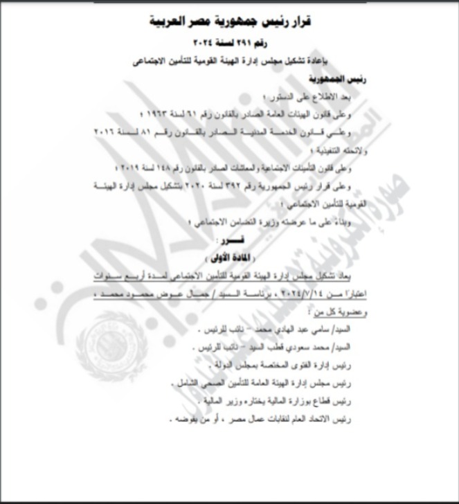 تأكيدًا لـ القاهرة 24.. قرار جمهوري بإعادة تشكيل مجلس إدارة الهيئة القومية للتأمين الاجتماعي