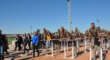 يؤدي المتقدم الاختبار الرياضي في عدد من التمرينات الرياضية المقررة ويكون للراسب حق الإعادة لمرة واحدة.