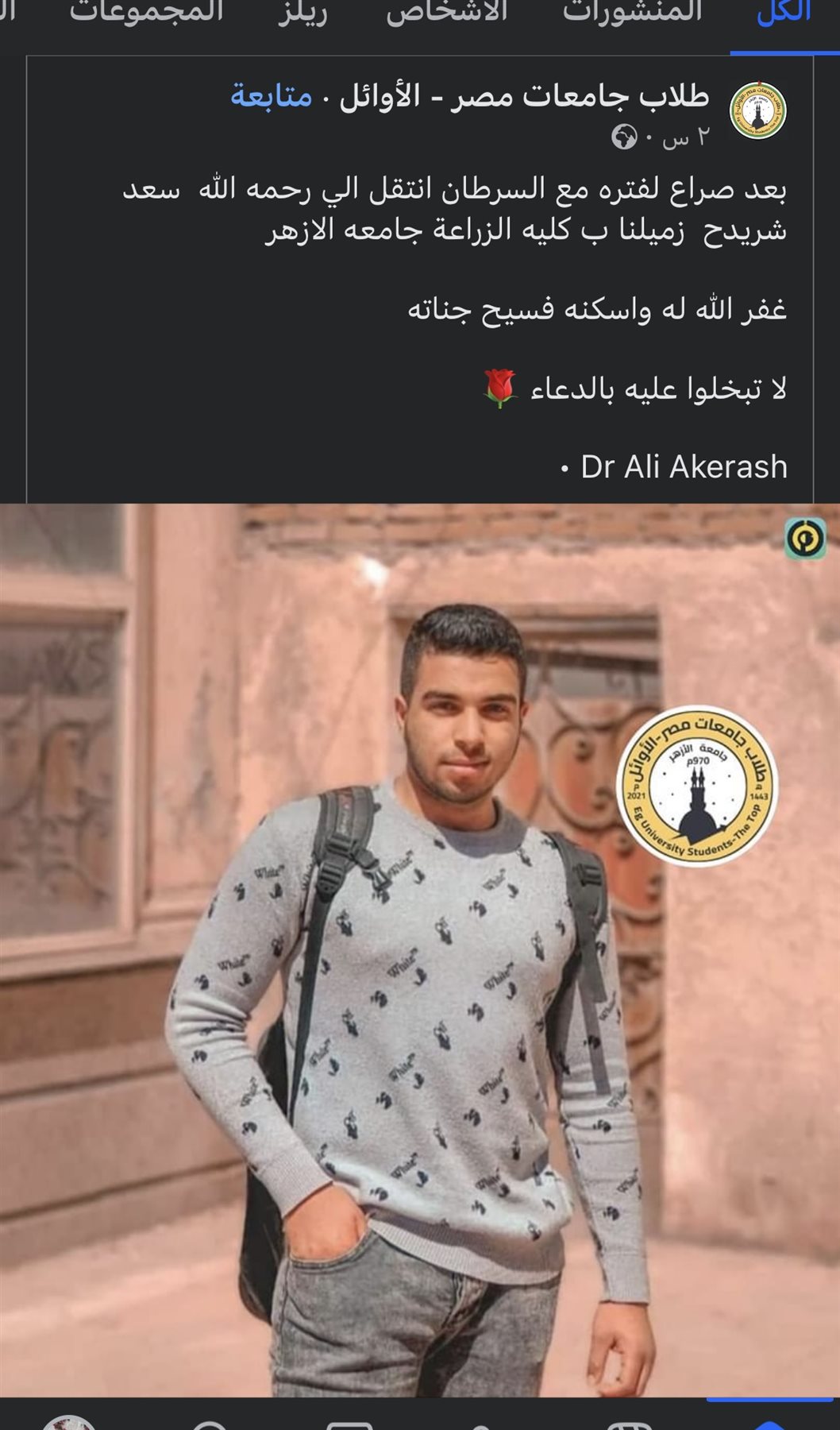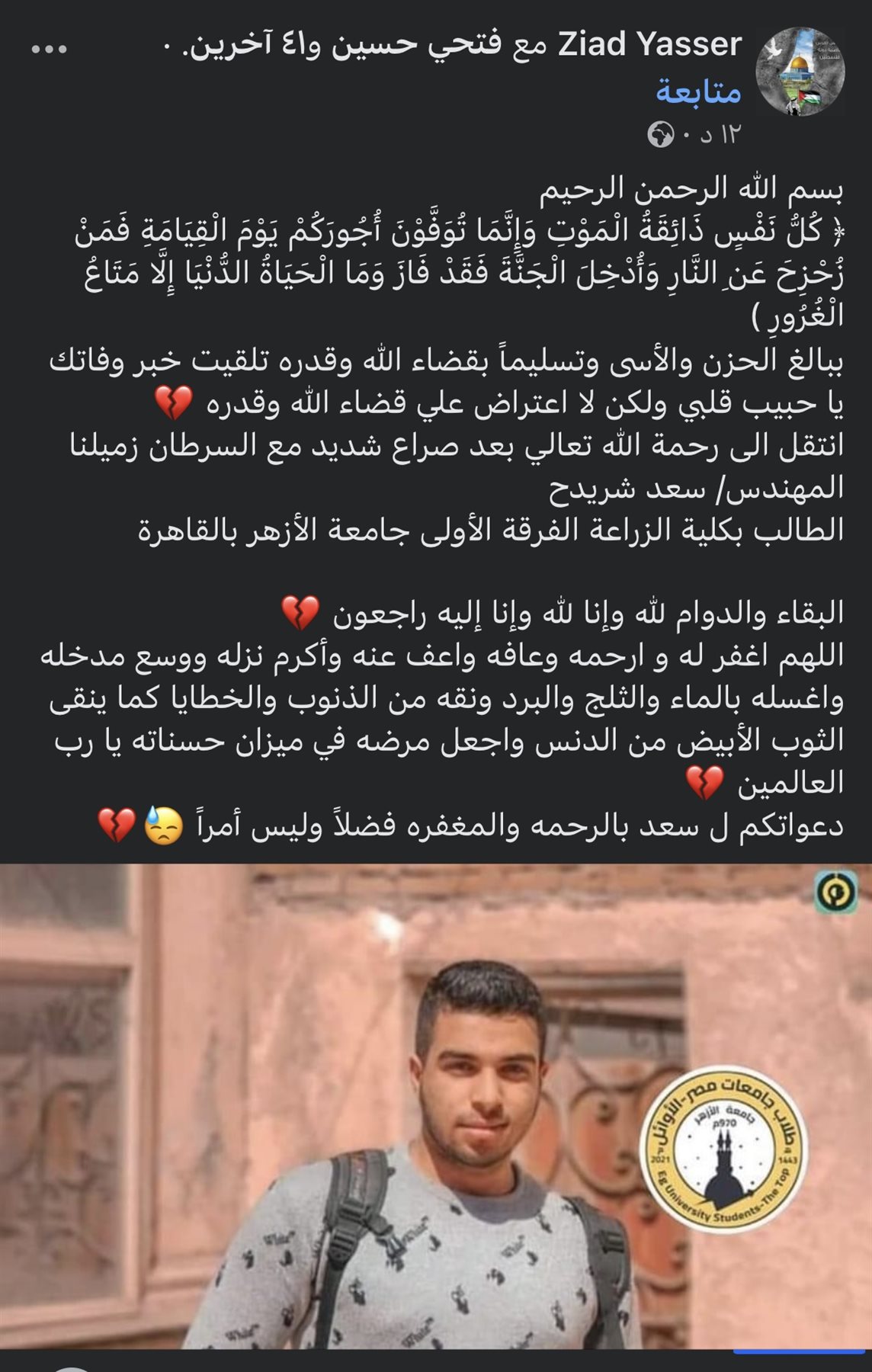 وفاة طالب بجامعة الأزهر بعد صراع مع السرطان