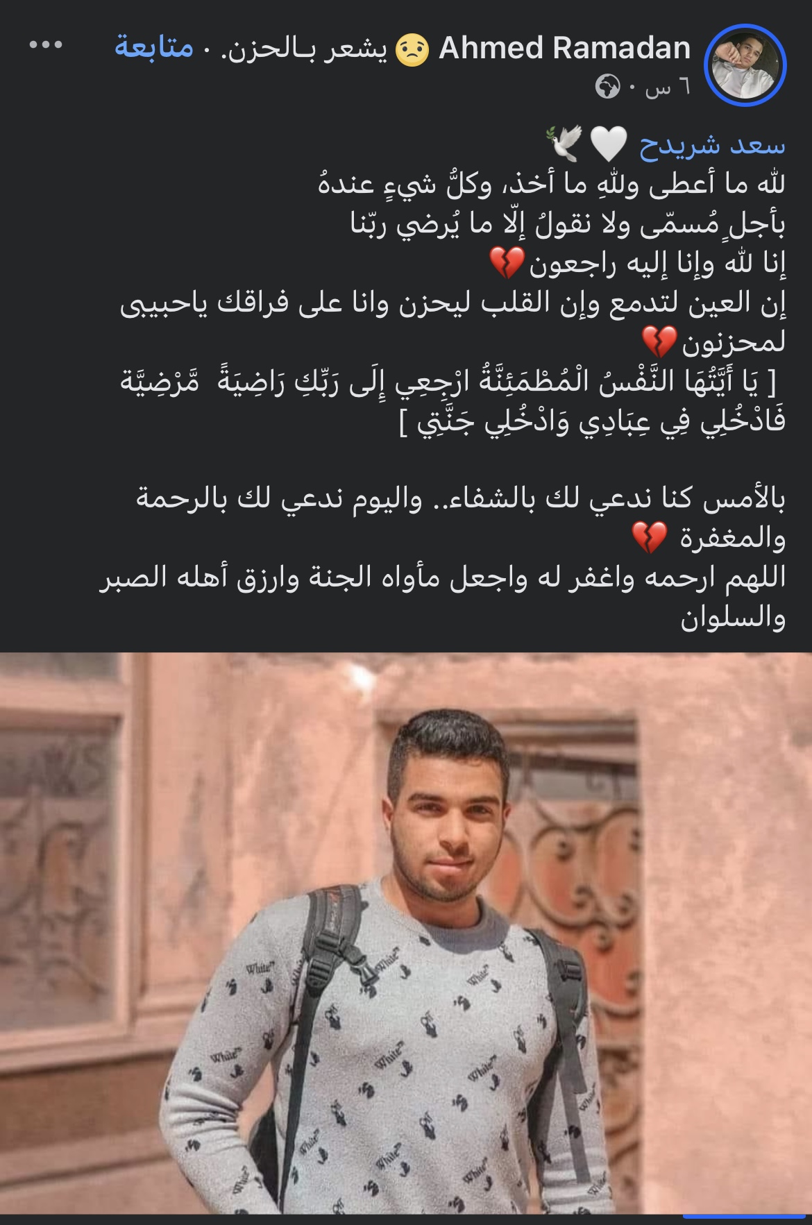 ونعت الجروبات التابعة لجامعة الأزهر الطالب عبر صفحات التواصل الاجتماعي في فيسبوك، كالتالي: كُلُّ نَفْسٍ ذَائِقَةُ الْمَوْتِ وَإِنَّمَا تُوَفَّوْنَ أُجُورَكُمْ يَوْمَ الْقِيَامَةِ فَمَنْ زُحْزِحَ عَنِ النَّارِ وَأُدْخِلَ الْجَنَّةَ فَقَدْ فَازَ وَمَا الْحَيَاةُ الدُّنْيَا إِلَّا مَتَاعُ الْغُرُورِ".. ببالغ الحزن والأسى وتسليمًا بقضاء الله وقدره تلقينا خبر وفاة الطالب سعد شريدح الطالب بكلية الزراعة الفرقة الأولى جامعة الأزهر بالقاهرة.