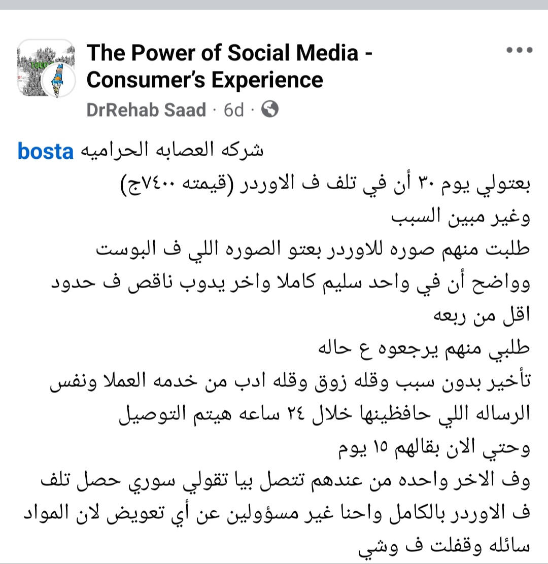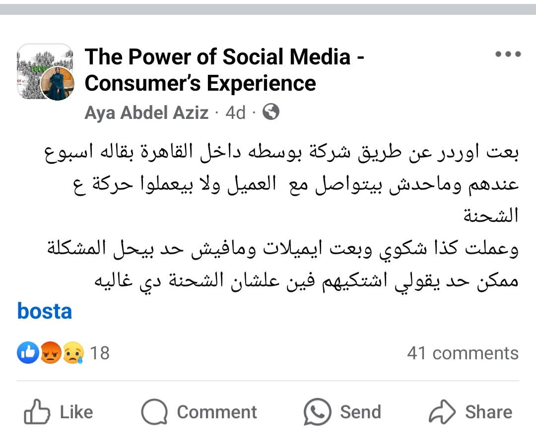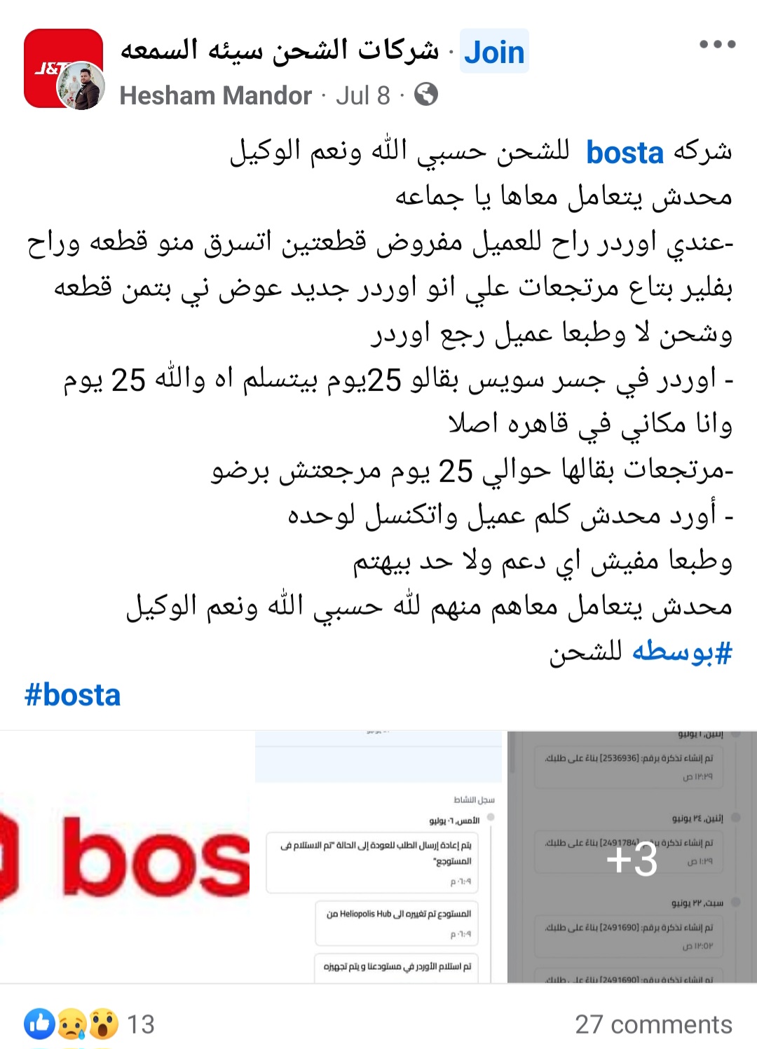 نشر أحد الحسابات على فيسبوك شكوى مكتوب فيها: أعتقد إن لو فيه شركة عندها خطة للانهيار السريع مش هتعمل أكتر من الخطوات اللي بتاخدها شركة بوسطة bosta في الفترة الحالية.