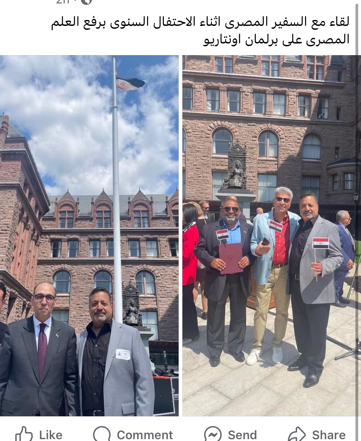 توجه الدكتور عادل تادرس، نائب حزب العدل ورئيس لجنة المصريين بالخارج، بالشكر للسفير أحمد حافظ، سفير جمهورية مصر العربية بكندا، على الدعوة التي وجهها لمجلس إدارة الاتحاد للمشاركة في الاحتفال باليوم الوطني لجمهورية مصر العربية.