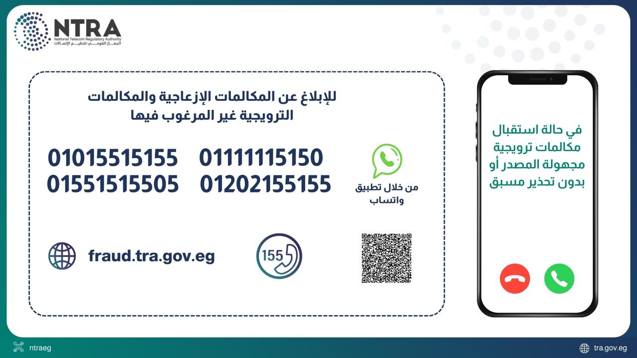 وخصص الجهاز القومي لتنظيم الاتصالات، أرقام: 01111115150 - 01015515155 - 01202155155 - 01551515505؛ لتمكين العملاء الإبلاغ عن المكالمات الإزعاجية، والمكالمات الترويجية غير المرغوب فيها عبر تطبيق واتساب.