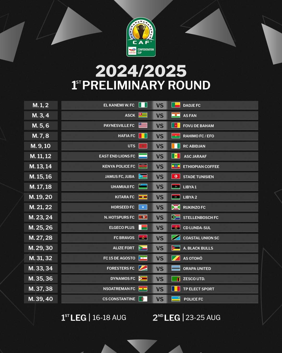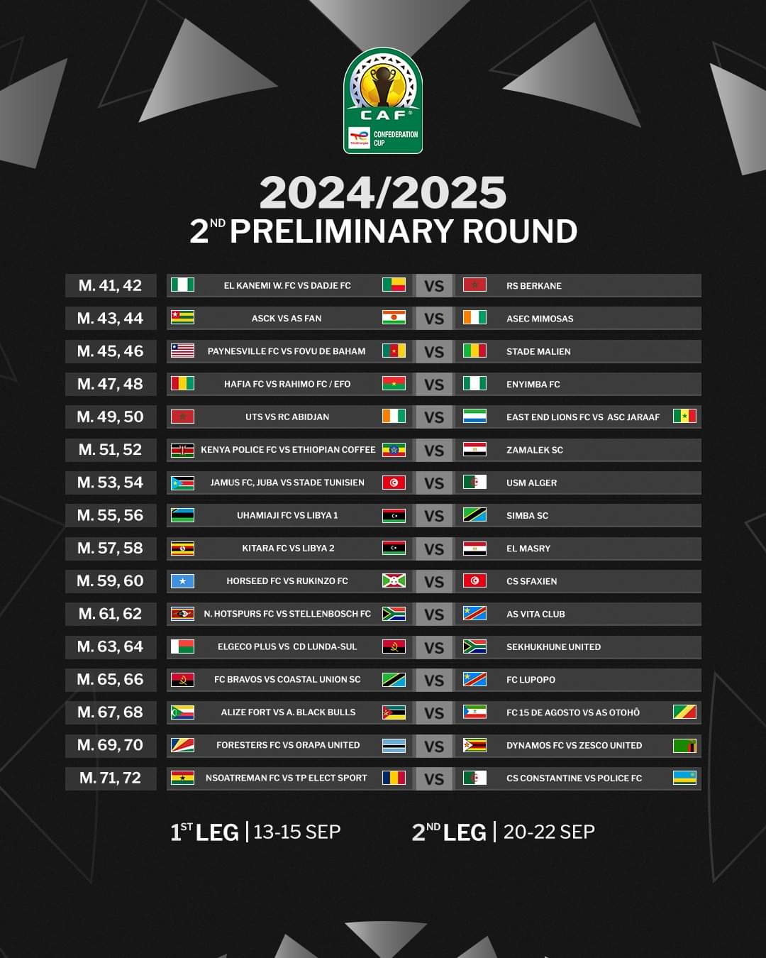 ووفقا لقرعة الكونفدرالية التي أجراها الاتحاد الإفريقي قبل نحو أسبوعين فإن أهلي طرابلس سيلاقي أومياجي بطل زنزبار في الدور التمهيدي الأول والفائز سيلاقي سيمبا التنزاني في الدور التمهيدي الثاني، فيما سيلاقي الهلال كيتارا اف سي بطل أوغندا في مباراة الدور التمهيدي الأول والفائز سيلاقي المصري في الدور التمهيدي الثاني، حيث ستقام مباراة الذهاب خارج مصر خلال الفترة من 13: 15 سبتمبر، فيما ستقام مباراة الإياب بمصر خلال الفترة من 20: 22 سبتمبر أيضًا.