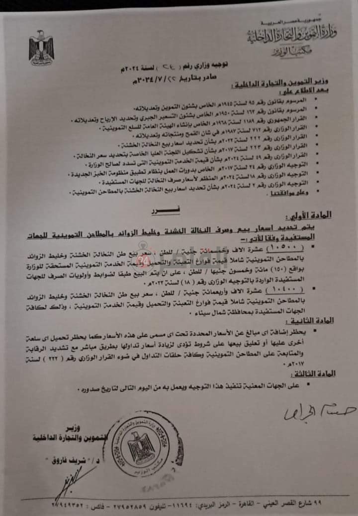 جاء ذلك وفق القرار الوزاري لوزير التموين الدكتور شريف فاروق، والذي حصلت القاهرة 24 نسخة منه.