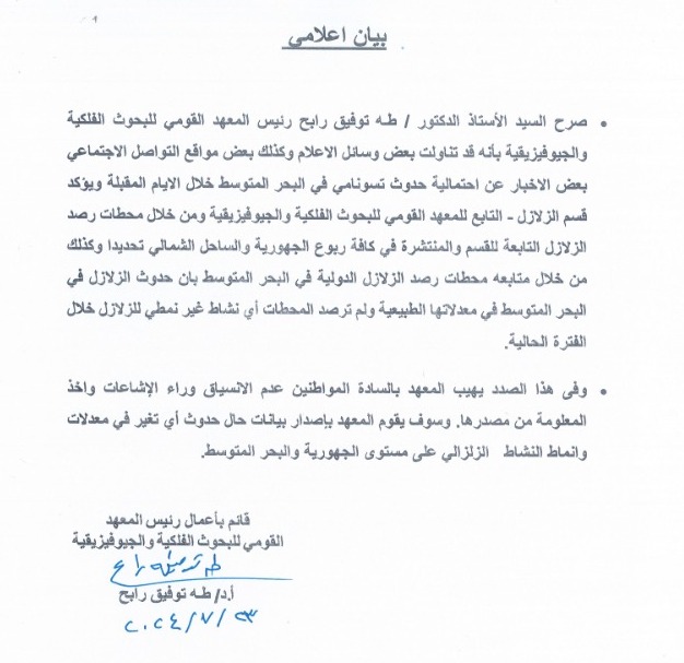 وتابع في بيان، أنه قد تناولت بعض وسائل الإعلام وكذلك بعض مواقع التواصل الاجتماعي، بعض الأخبار عن احتمالية حدوث تسونامي في البحر المتوسط، خلال الأيام المقبلة.