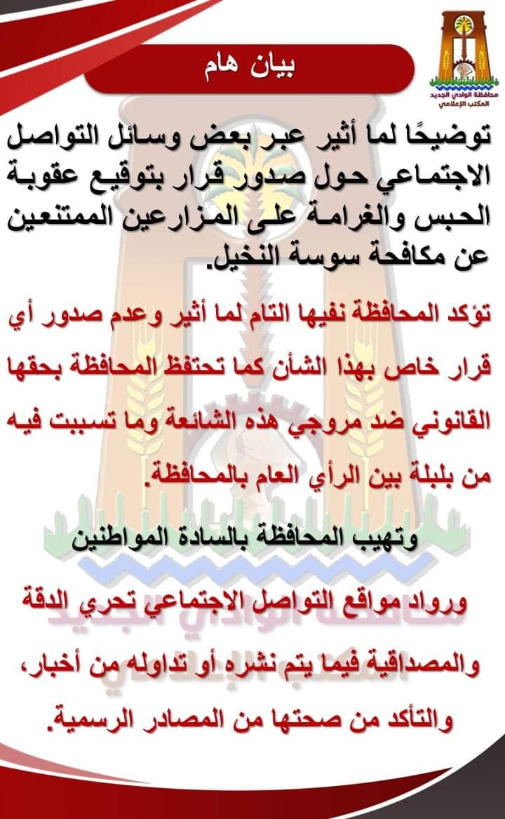 أكدت محافظة الوادي الجديد، في بيان لها، نفيها التام عن ما أثير عبر بعض وسائل التواصل الاجتماعي، حول صدور قرار بتوقيع عقوبة الحبس والغرامة على المزارعين الممتنعين عن مكافحة سوسة النخيل.