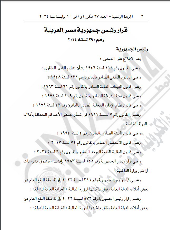نشرت الجريدة الرسمية في عددها الصادر اليوم الثلاثاء، قرار رئيس الجمهورية، بشأن إزالة صفة النفع عن بعض أملاك الدولة العامة.