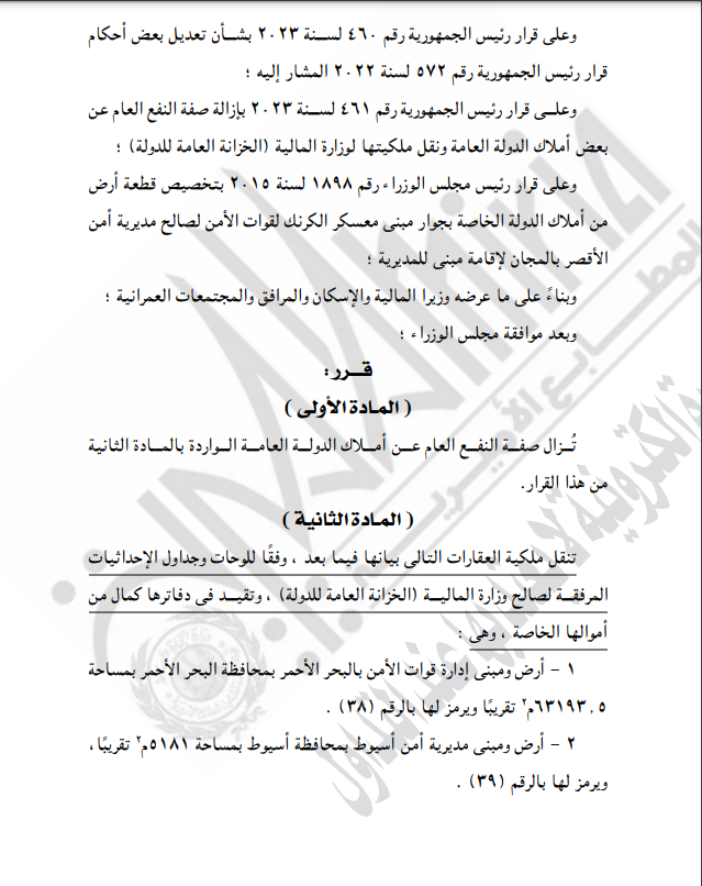 ونص القرار الصادر في المادة الأولى على أن تزال صفة النفع العام عن أملاك الدولة العامة الواردة بالمادة الثانية.