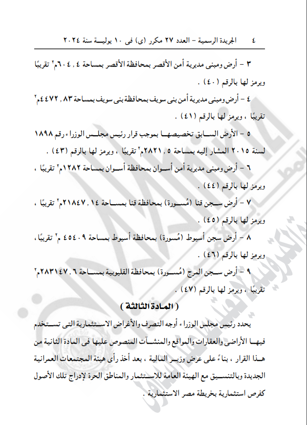 فيما نصت المادة الثالثة على أن يحدد رئيس مجلس الوزراء أوجه التصرف والأغراض الاستثمارية التي تستخدم فيها الأراضي والعقارات والمواقع والمنشآت المنصوص عليها في المادة الثانية من هذا القرار، بناءً على عرض وزير المالية، بعد أخذ رأى هيئة المجتمعات العمرانية الجديدة وبالتنسيق مع الهيئة العامة للاستثمار والمناطق الحرة لإدراج تلك الأصول كفرص استثمارية بخريطة مصر الاستثمارية.