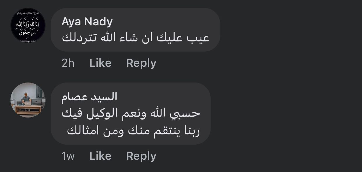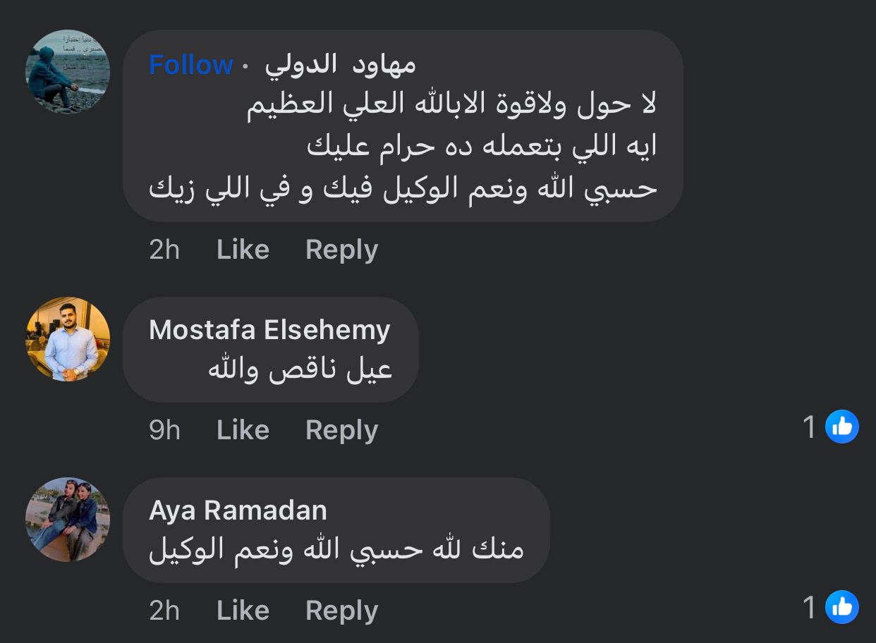 وأضاف مستخدم آخر: لا حول ولا قوة إلا بالله العلي العظيم.. ايه اللي بتعمله ده حرام عليك حسبي الله ونعم الوكيل فيك وفي اللي زيك، ومستخدم آخر يكتب: عيب عليك إن شاء الله تترد لك، آخر قال: ربنا ينتقم منك ومن امثالك.