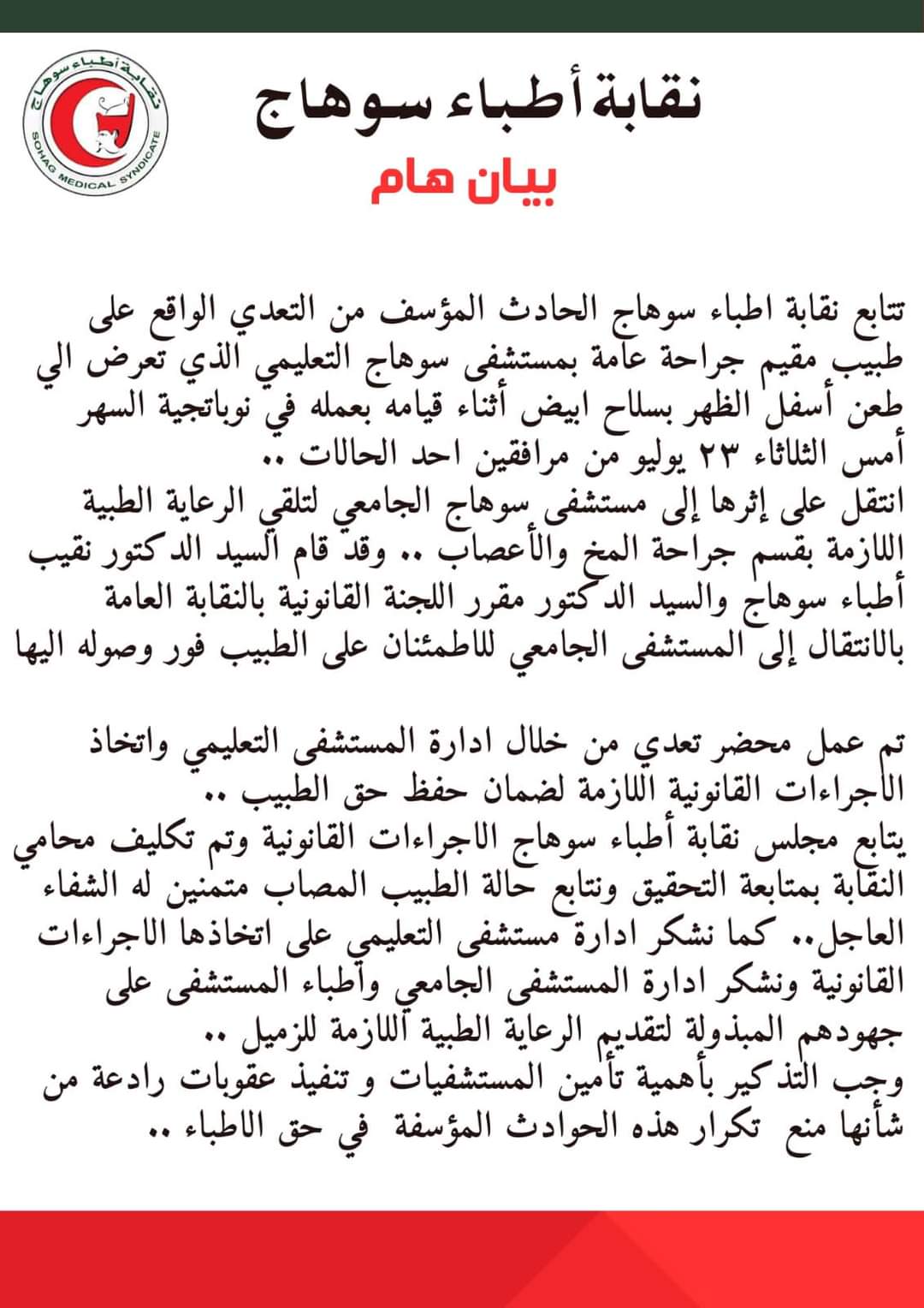 نقابة أطباء سوهاج تدين الواقعة وتتخذ الإجراءات القانونية اللازمة