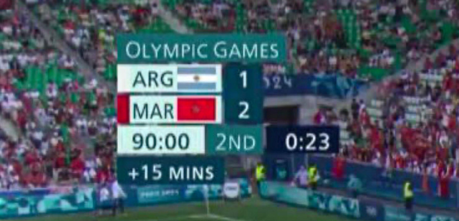 بعدها، راجع الحكم تقنية الفيديو لوجود شكوك حول هدف الأرجنتين الثاني، وبعد العودة لتقنية الفيديو اتضح أن الهدف كان تسللًا، وتم إلغاؤه لتعود النتيجة إلى تقدم أسود الأطلس على التانجو بهدفين لهدف، ولُعب 3 دقائق إضافية في المباراة بعد النهاية؛ وبعدها أطلق الحكم صافرة النهاية معلنًا فوز المغرب على الأرجنتين في افتتاح مشوار المنتخبين بأولمبياد باريس 2024.