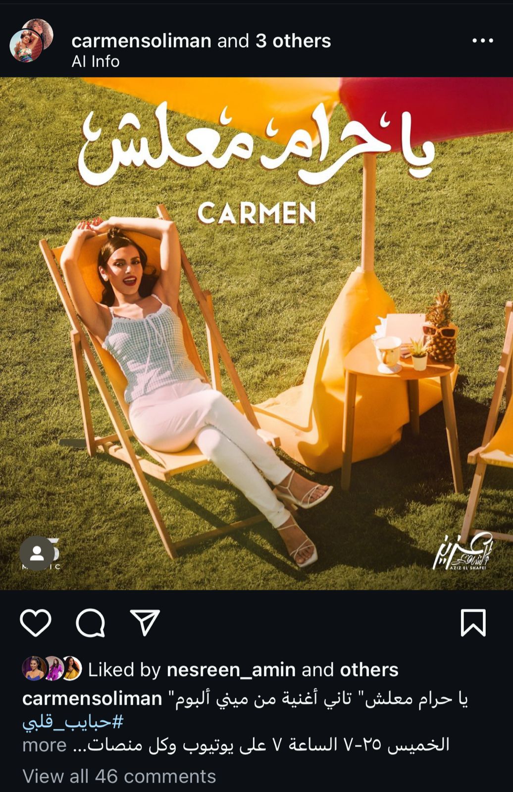 وورجت كارمن سليمان عبر حسابها الرسمي بموقع تبادل الصور والفيديوهات انستجرام للبرومو التشويقي لأغنيتها، وعلقت عليها قائلة: يا حرام معلش، تاني أغنية من ميني ألبوم يوم الخميس الساعة 7 مساءً على يوتيوب، وكل منصات الموسيقى.