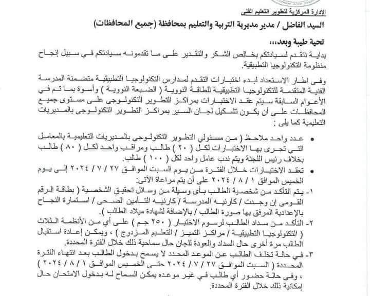وأرسلت الوزارة خطابا إلى المديريات التعليمية، جاء فيه: في إطار الاستعداد لبدء اختبارات التقدم لمدارس التكنولوجيا التطبيقية متضمنة المدرسة الفنية المتقدمة للتكنولوجيا التطبيقية للطاقة النووية (الضبعة النووية، وأسوة بما تم في الأعوام السابقة سيتم عقد الاختبارات بمراكز التطوير التكنولوجي على مستوى جميع المحافظات على أن يكون تشكيل لجان السير بمراكز التطوير التكنولوجي بالمديريات التعليمية كما يلي: