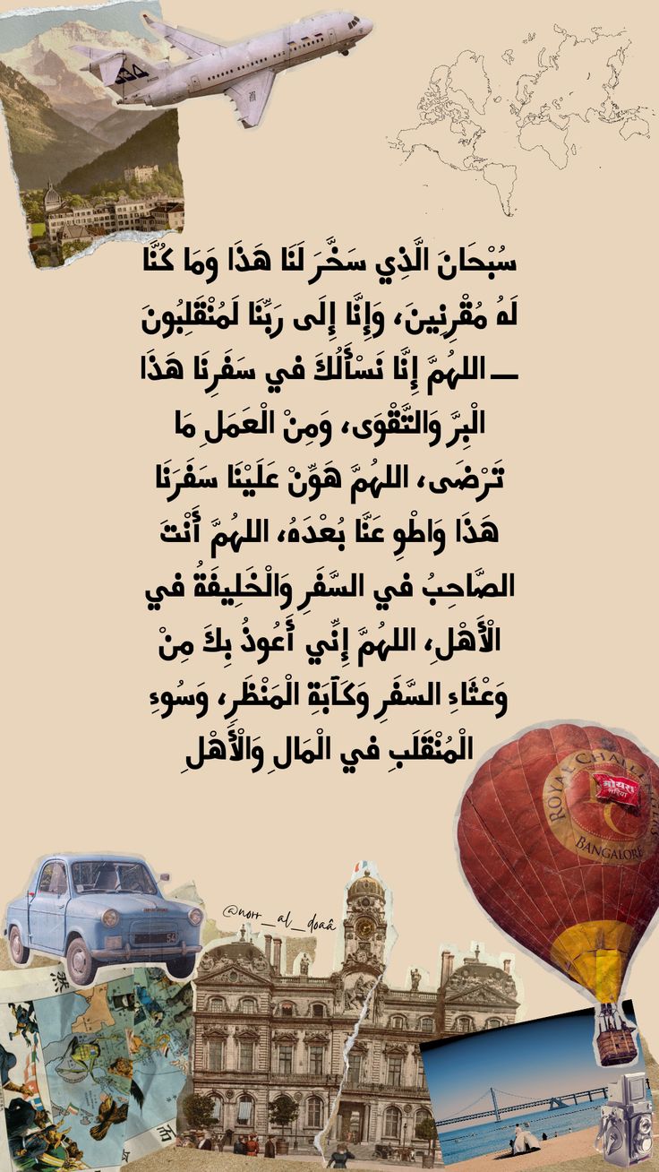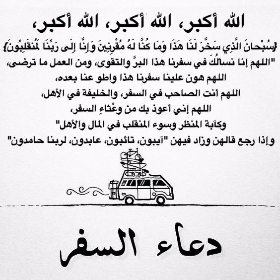 اللهم إنا نسألك في سفرنا هذا البر والتقوى، ومن العمل ما ترضى، اللهم هون علينا سفرنا هذا واطو عنا بعده، اللهم أنت الصاحب في السفر، والخليفة في الأهل، اللهم إني أعوذ بك من وعثاء السفر، وكآبة المنظر، وسوء المنقلب في المال والأهل.