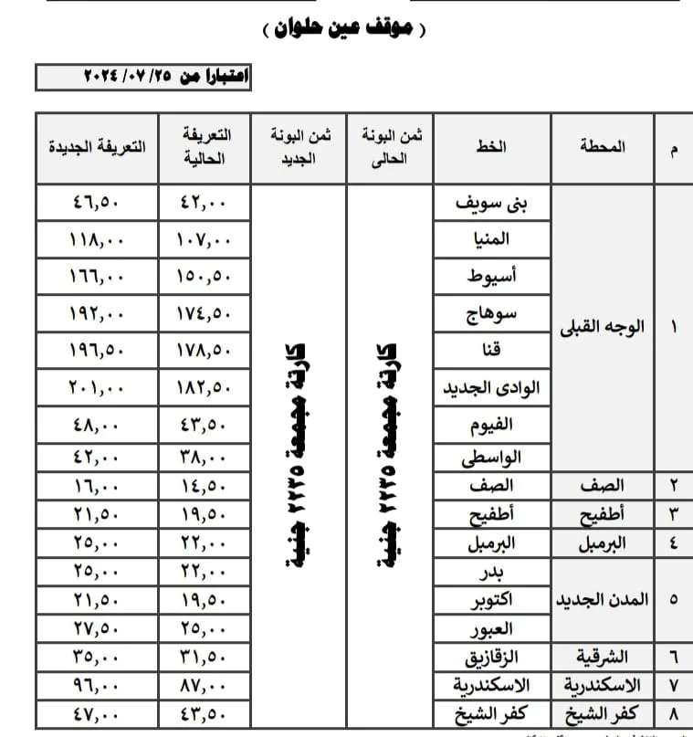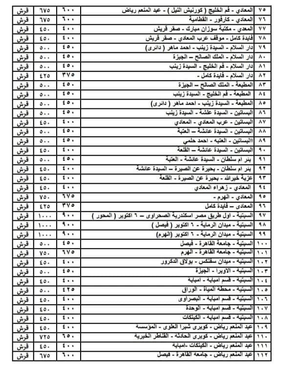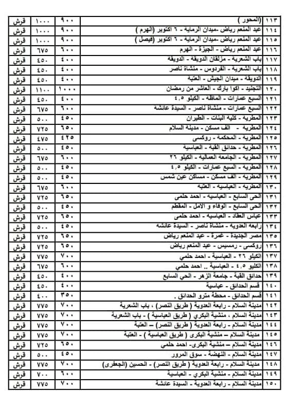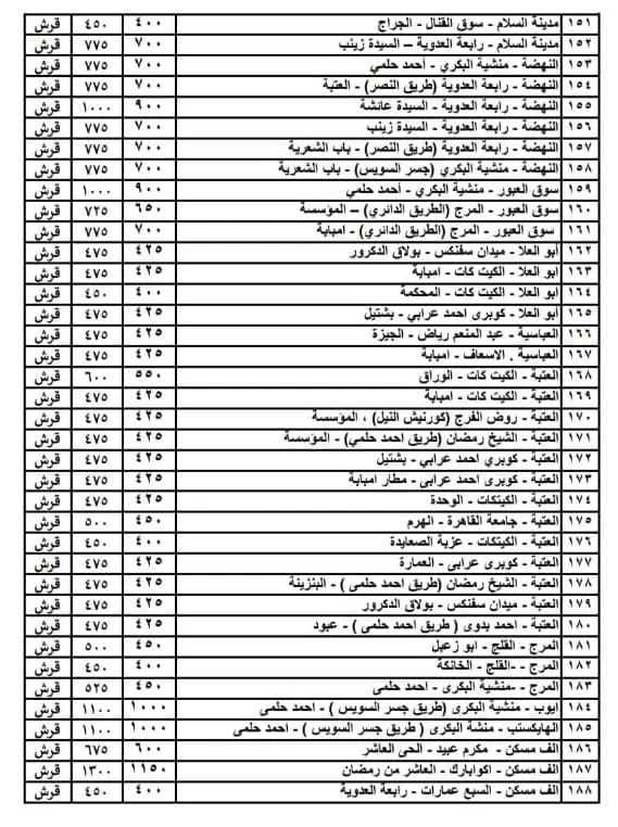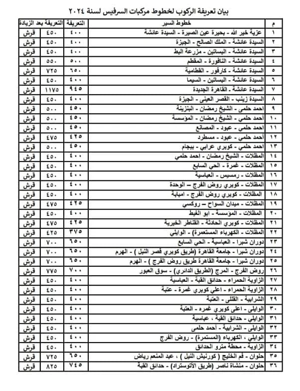 قائمة أسعار المواصلات الجديدة