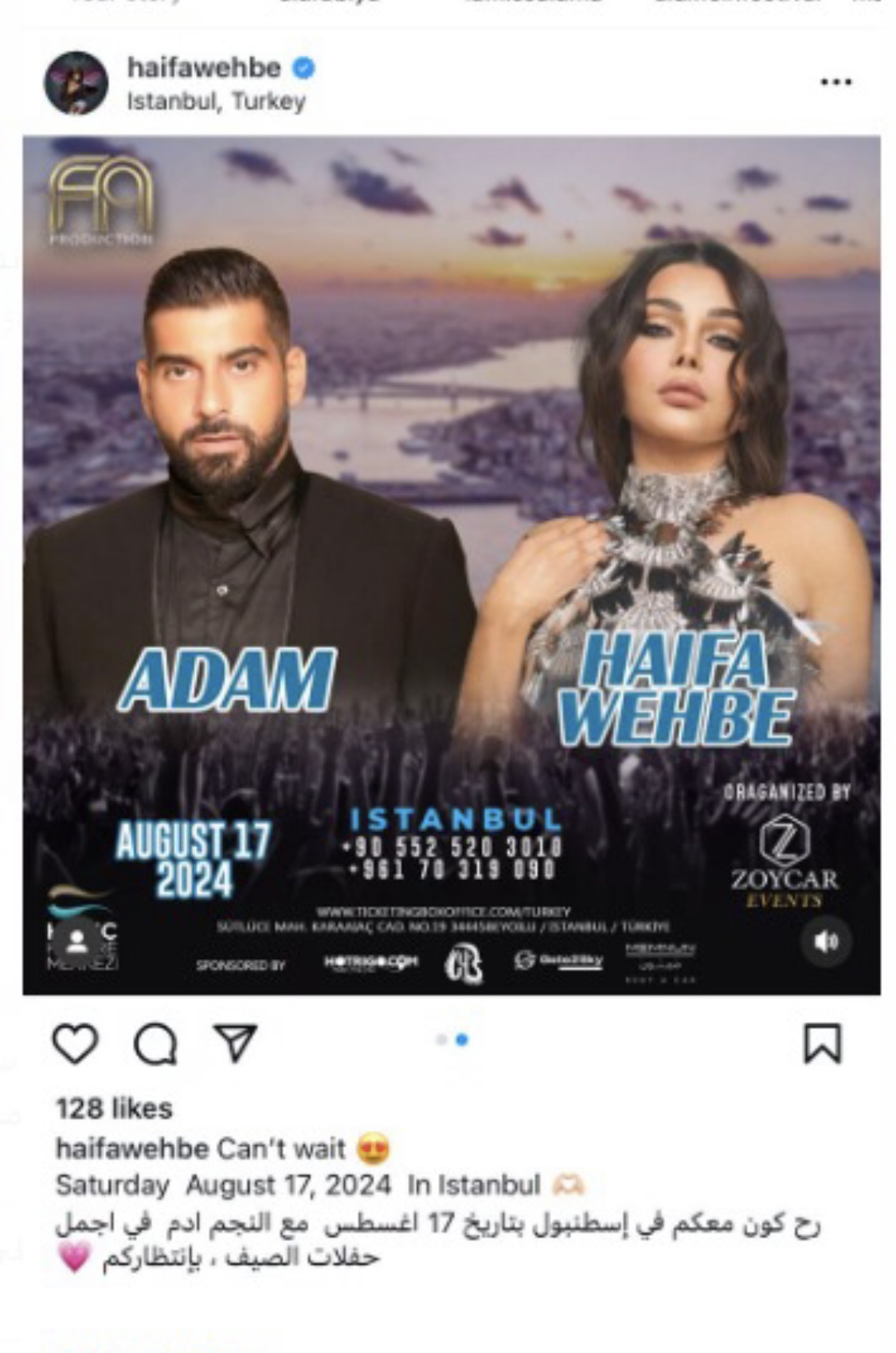 ونشرت هيفاء وهبي برومو الحفل عبر حسابها الرسمي بموقع تبادل الصور والفيديوهات إنستجرام، وعلقت عليها قائلة: رح أكون معكم في إسطنبول يوم 17 أغسطس، من النجم آدم، في أجمل حفلات الصيف في انتظاركم.