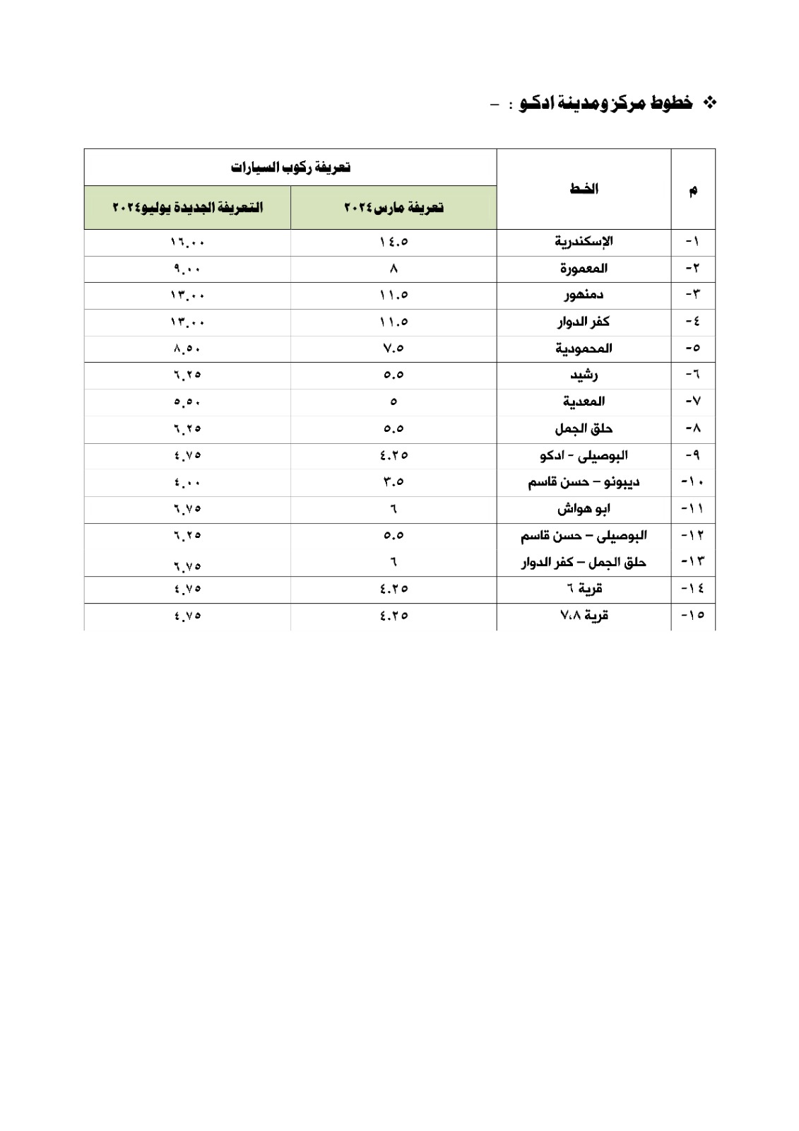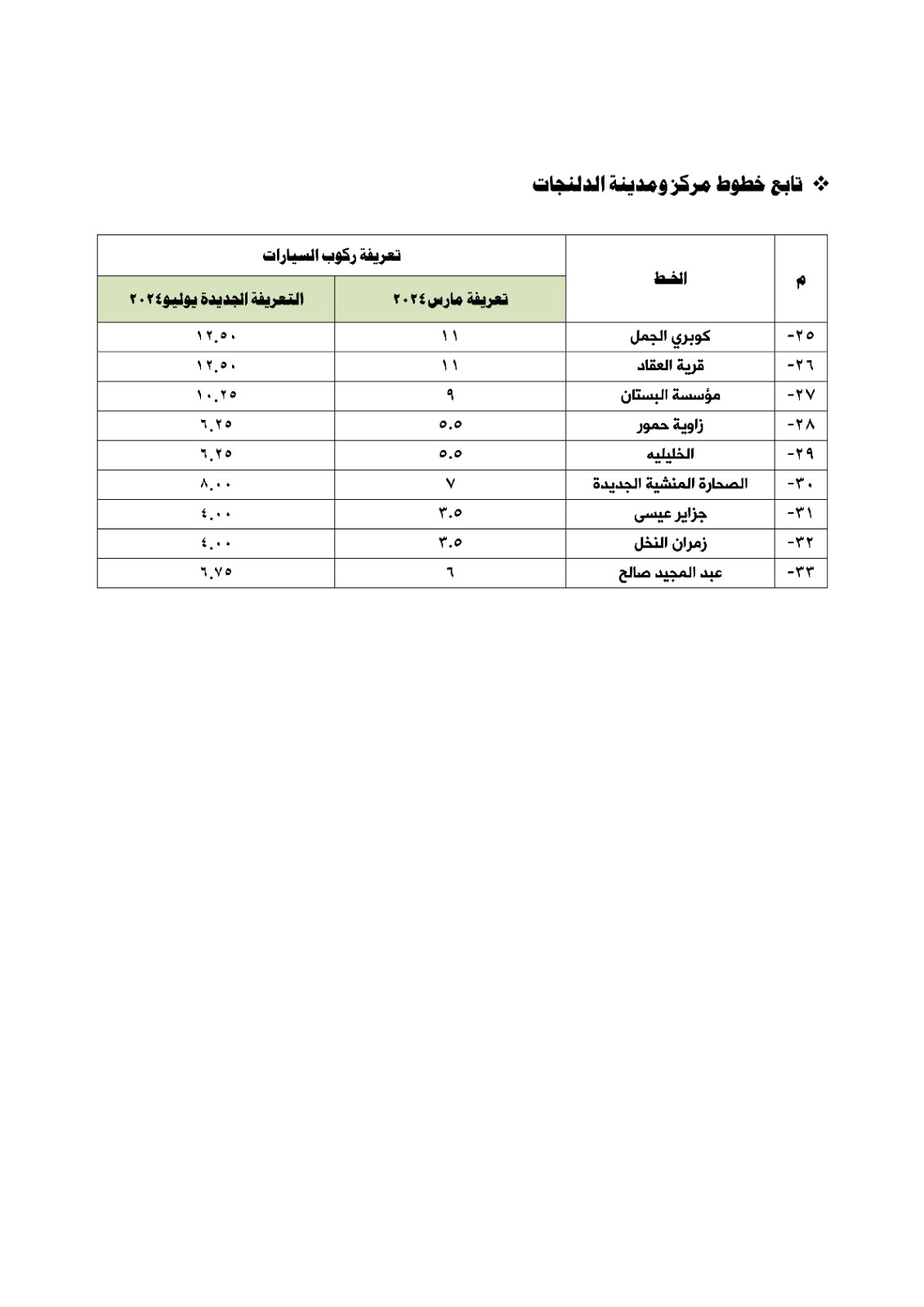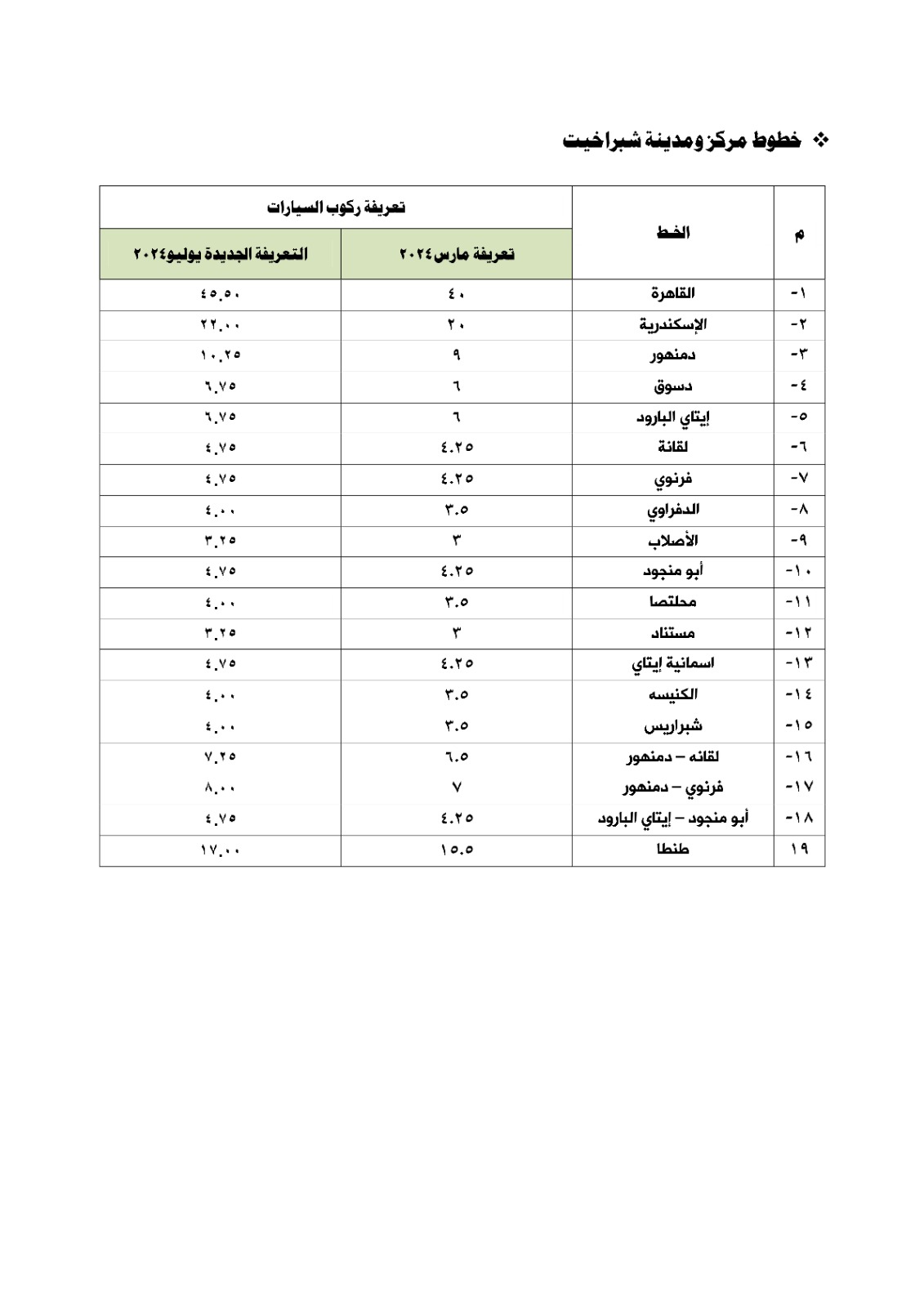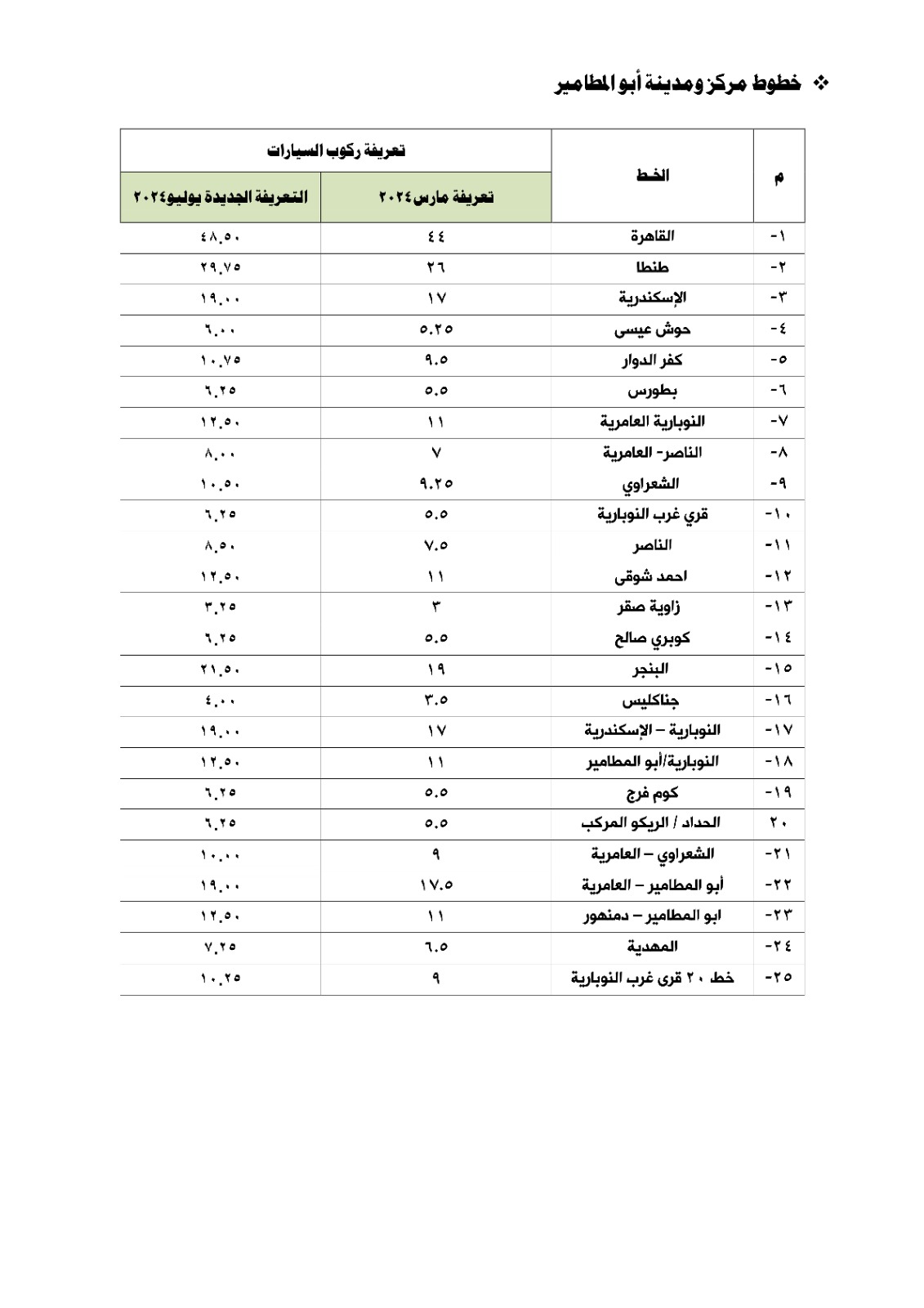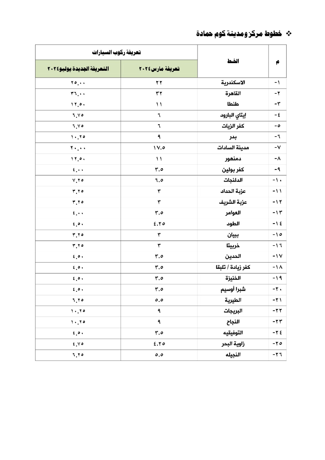 وتم زيادة تعريفة ركوب السيارات الأجرة العاملة على الخطوط الداخلية والخارجية بين مراكز المحافظة بعضها البعض وبينها وبين المحافظات الأخرى، وجاءت زيادة تعريفة ركوب السيارات والمركبات المبينة على النحو التالى:-