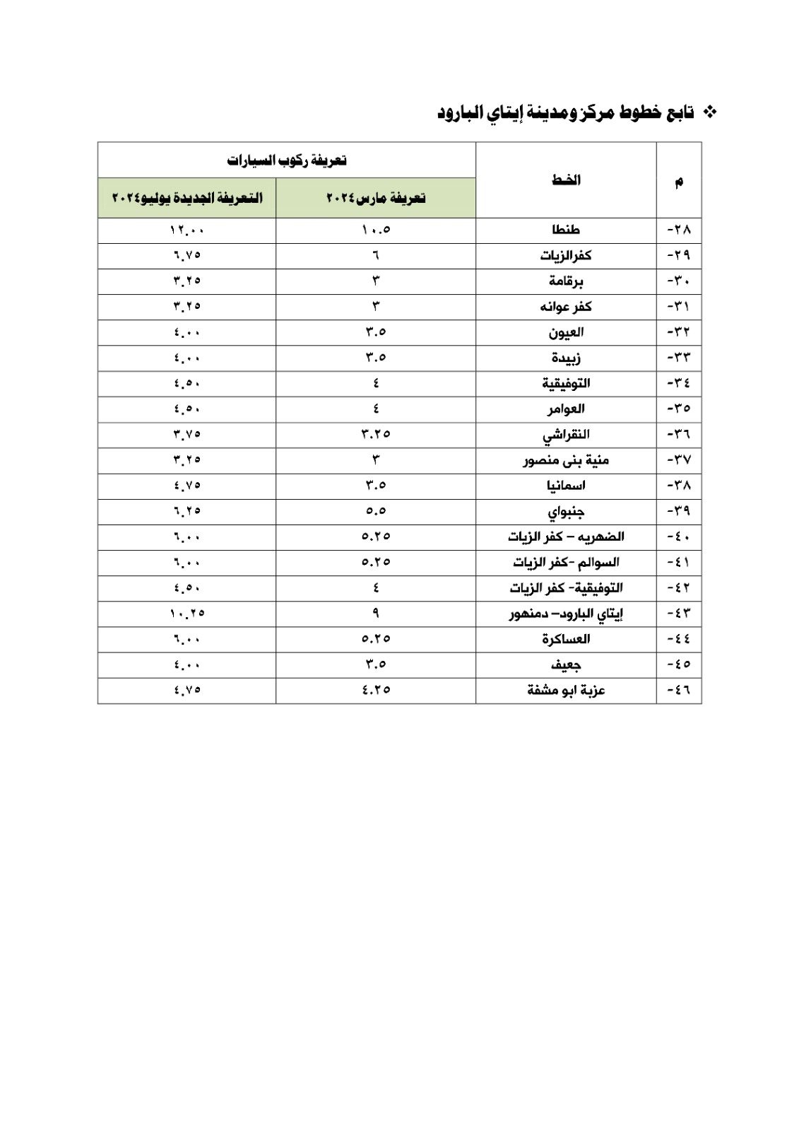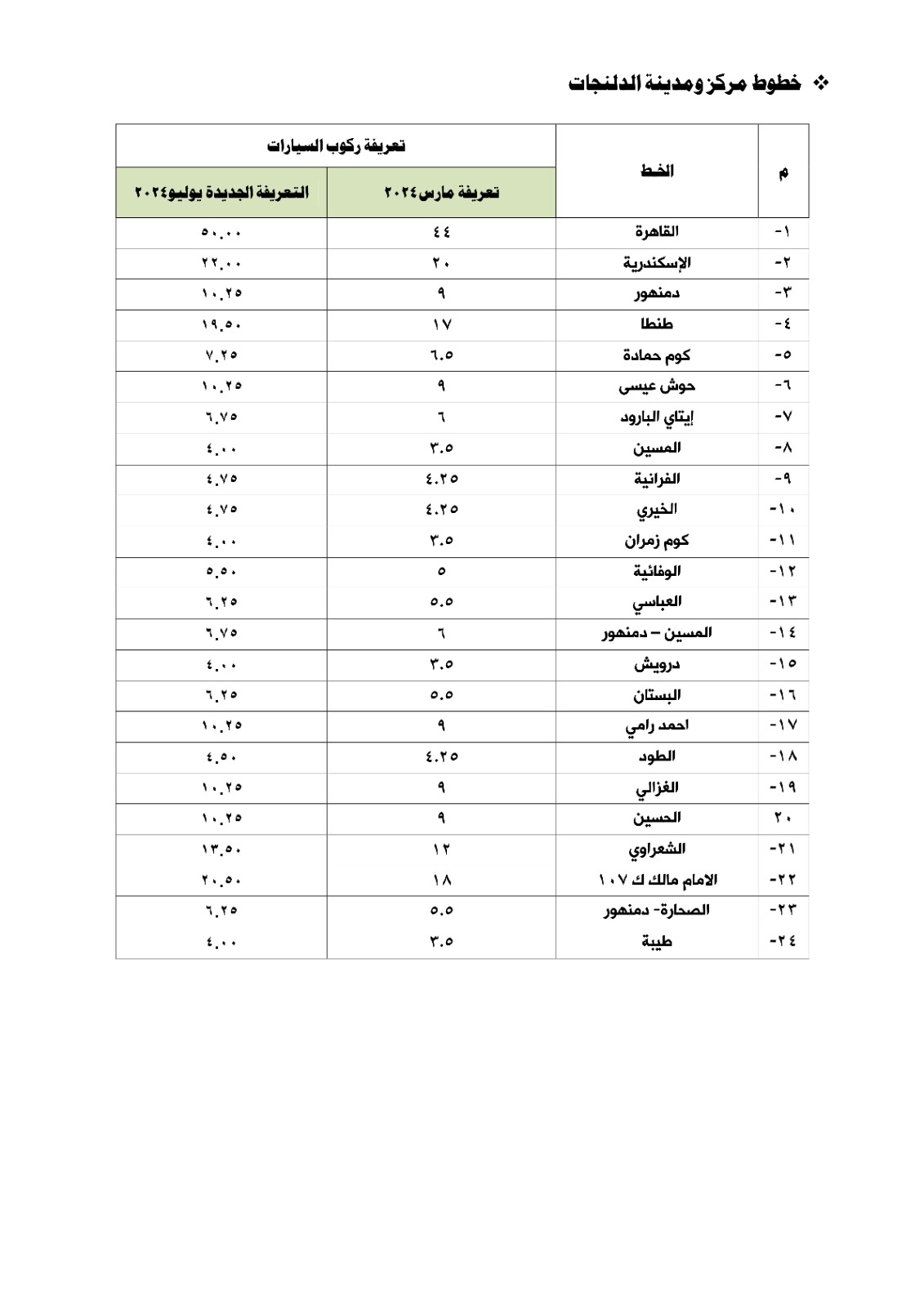 - قيمة تذكرة مركبات مشروع النقل الداخلي من 3.50 جنيه لتصبح 4 جنيهات.