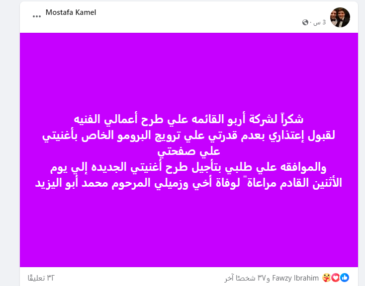 وكتب مصطفى كامل في منشور له عبر موقع فيس بوك: شكرًا لشركة أربو القائمة على طرح أعمالي الفنية لقبول اعتذاري بعدم قدرتي على ترويج البرومو الخاص بأغنيتي على صفحتي، والموافقة على طلبي بتأجيل طرح أغنيتي الجديدة إلى يوم الاثنين المقبل مراعاة ً لوفاة أخي وزميلي المرحوم محمد أبو اليزيد.