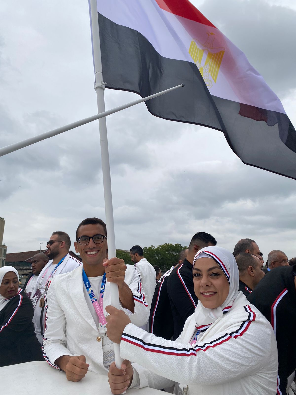 قام نجما البعثة المصرية سارة سمير صاحبة برونزية أولمبياد ريو في رفع الأثقال، وأحمد الجندي صاحب فضية أولمبياد طوكيو في الخماسي الحديث، بحمل علم مصر في حفل افتتاح دورة الألعاب الأولمبية باريس 2024، المقامة خلال الفترة من 26 يوليو الجاري حتى 11 أغسطس المقبل.