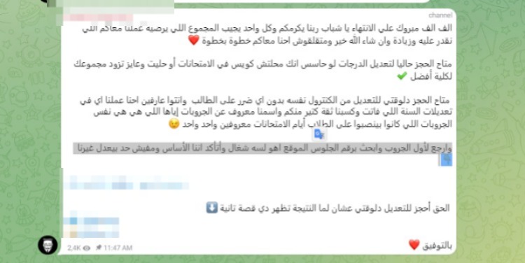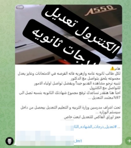 ونشر أدمن شاومينج، بعد ساعات من رسالته، فيديو زعم أنه من داخل كنترولات الثانوية العامة، وأنه خاص بأعمال تعديل نتيجة الثانوية العامة، تحت عنوان هام، معلقًا عليه بقوله: “لكل طالب ثانوية عامة وأزهرية، فاته الفرصة في الامتحانات وعايز يعدل مجموعه يلحق يتواصل مع الدكتور”، مردفًا تحت مسمى تنبيه: “نرجو مشاهدة الفيديو جيدًا، ويفضل تواصل أولياء الأمور للتواصل مع الكنترول، إحنا هنا هنقدر تساعدك ترفع مجموع شهادتك الثانوية بنسبة تصل إلى 97 %”.