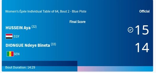 ونجحت المبارزة المصرية آية شريف التي تحتل المركز 55 في التنصيف العالمي الفوز على السنغالية نداي بينيتا ديونج صاحب المركز 73 في سلاح المبارزة، في المواجهة التي جمعت بينهما ضمن منافسات دور الـ 64 من منافسات المبارزة.