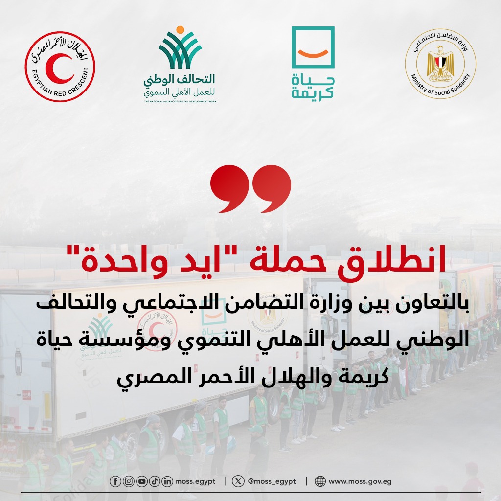 أعلنت الدكتورة مايا مرسي وزيرة التضامن الاجتماعي، انطلاق الحملة التنموية الشاملة تحت عنوان إيد واحدة، اعتبارًا من اليوم السبت، والتي تنفذها الوزارة بالتعاون مع التحالف الوطني للعمل الأهلي التنموي ومؤسسة حياة كريمة والهلال الأحمر المصري، وذلك لخدمة مليون ونصف المليون أسرة من الأسر الأكثر احتياجا.