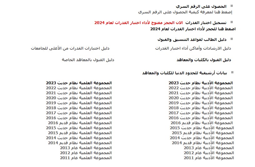 وبدأت بعض الكليات في استقبال طلبات حجز اختبار القدرات لطلاب الثانوية العامة الراغبين في الالتحاق بها، حيث تقدم نحو 18500 طالب وطالبة لأداء اختبارات القدرات تأهبًا لإعلان تنسيق الكليات 2024 للالتحاق بكليات الفنون الجميلة والتطبيقية وكليات التربية الرياضية.