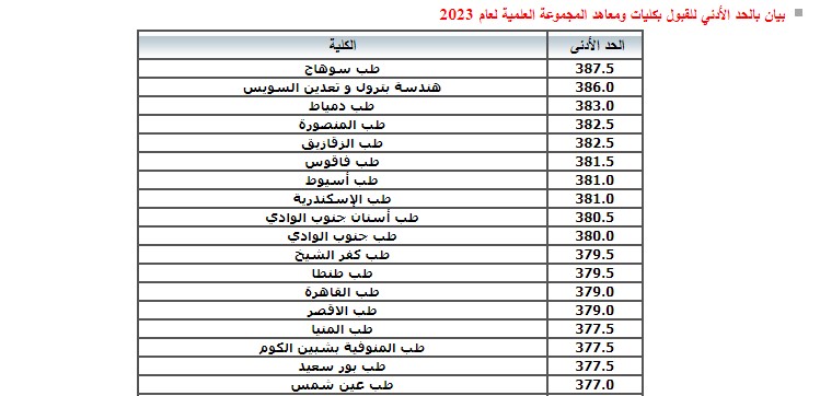 وخلال العام الماضي كان تنسيق الكليات لطلاب الثانوية العامة شعبة علوم يقبل من المجموع التالي للمرحلة الأولى: