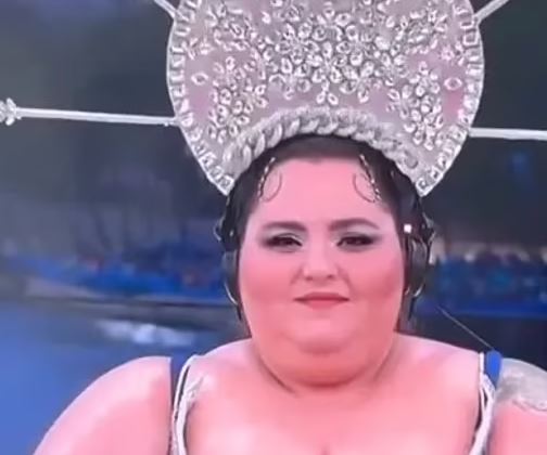 ولفت أنظار المشاهدين لمحاكاة العشاء الأخير، السيدة السمينة التي ارتدت تاجًا على شكل هالة وارتدت زيًا أزرق وفضيًا بينما وقفت أمام معداتها الموسيقية محاطة بالعديد من الراقصين والفنانين.