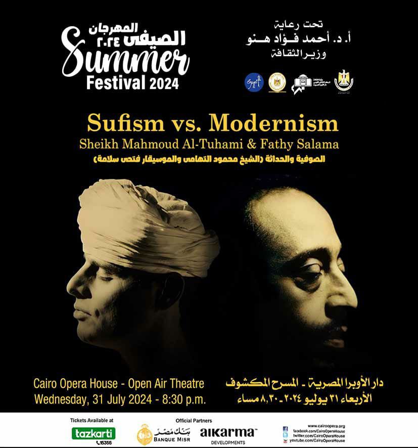 تتوالى فعاليات المهرجان الصيفى للموسيقى والغناء الذي تنظمه دار الأوبرا المصرية برئاسة الدكتورة لمياء زايد، تحت رعاية الدكتور أحمد فؤاد هنو، وزير الثقافة، بحفل مميز يمزج بين الصوفية والموسيقى العصرية تحت عنوان الصوفية والحداثة،ويحييه الموسيقار فتحي سلامة مع الشيخ محمود التهامي، فى إطار تعاون فني يهدف لتقديم الفن الصوفي برؤية جديدة وذلك يوم الأربعاء الموافق 31 يوليو، على المسرح المكشوف، في تمام الساعة الثامنة والنصف مساءً.