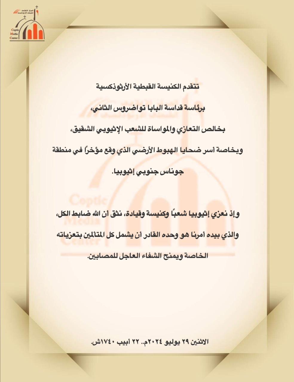 تقدمت الكنيسة القبطية الأرثوذكسية برئاسة قداسة البابا تواضروس الثاني، بخالص التعازي والمواساة للشعب الإثيوبي الشقيق، وبخاصة أسر ضحايا الهبوط الأرضي الذي وقع مؤخرًا في منطقة جوناس جنوبي إثيوبيا.