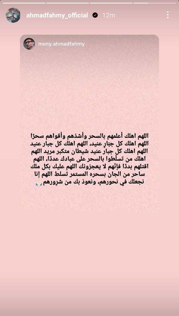 كما نشر أحمد فهمي مجموعة من الآيات القرآنية التي تقي من السحر وذلك عبر ستوري حسابه بموقع تبادل الصور والفيديوهات إنستجرام.