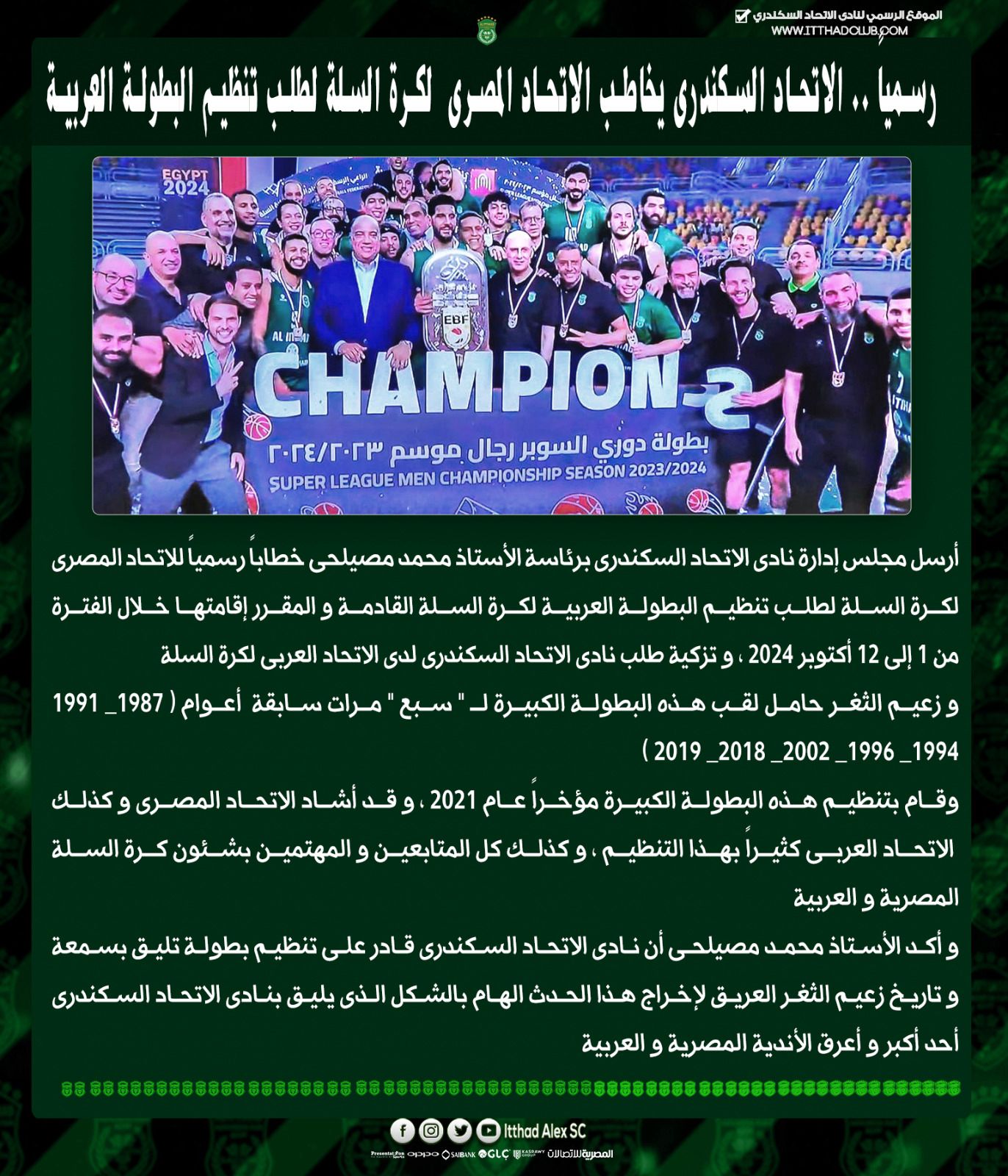 أرسل مجلس إدارة نادى الاتحاد السكندرى برئاسة محمد مصيلحى خطابًا رسميًا للاتحاد المصري لكرة السلة، لطلب تنظيم البطولة العربية لكرة السلة القادمة، والمقرر إقامتها خلال الفترة من 1 إلى 12 أكتوبر 2024، وتزكية طلب نادي الاتحاد السكندري لدى الاتحاد العربي لكرة السلة.